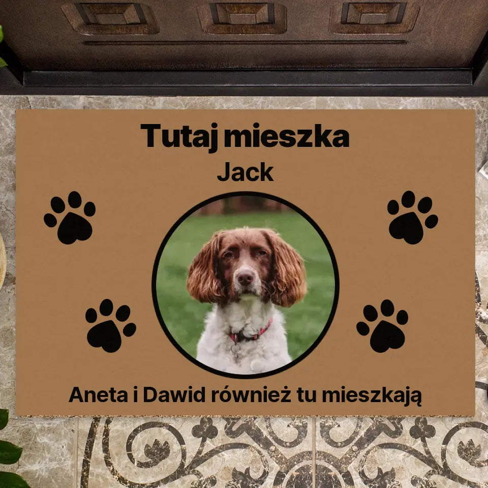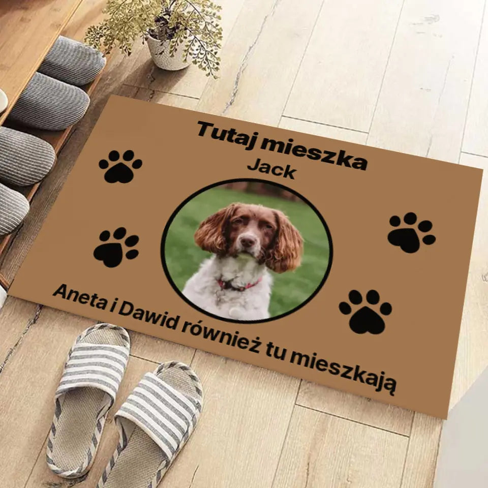 Dodaj zdjęcie swojego psa! Tutaj Mieszka twoj pies - Spersonalizowany dywanik pod drzwi