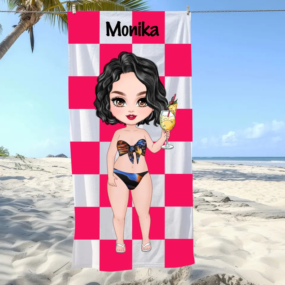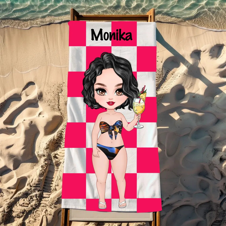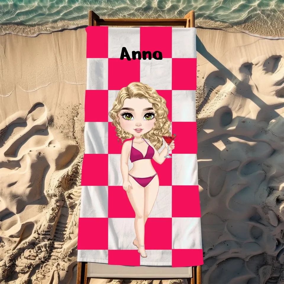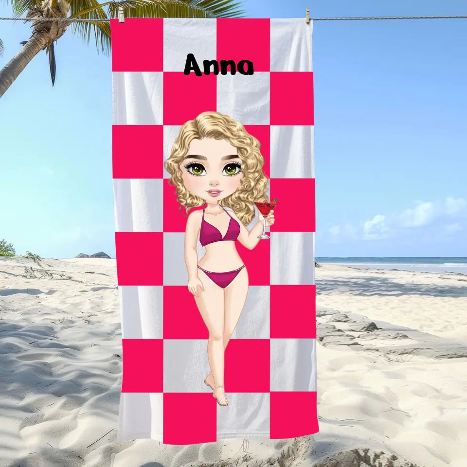 Dziewczyna w kostiumie kąpielowym (kwadraty) - Ręcznik plażowy, wyjątkowy prezent dla przyjaciółek